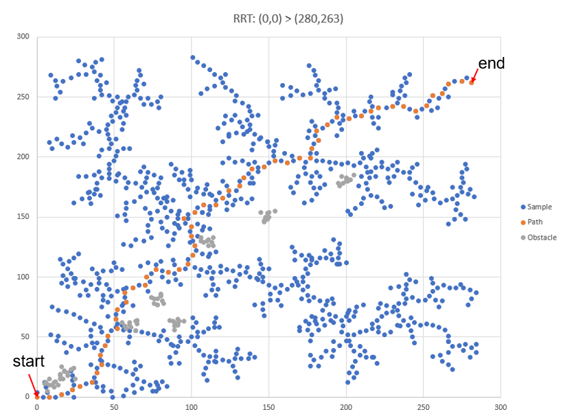 시작지점에서 목적지점으로 도달할 때까지 랜덤포인트를 계속적으로 생성하고 가까이 있는 노드와 연결지으며 확장하여 탐색하는 기술