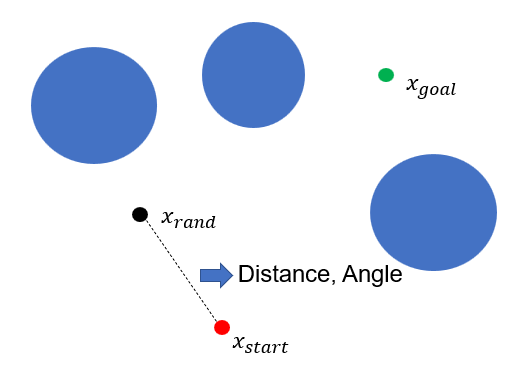 초기 지점을 start로 하고 난수를 이용해 랜덤한 좌표를 지닌 노드를 생성하고 이미 생성되어진 노드들중에 가장 가까이 위치한 노드를 찾는다.