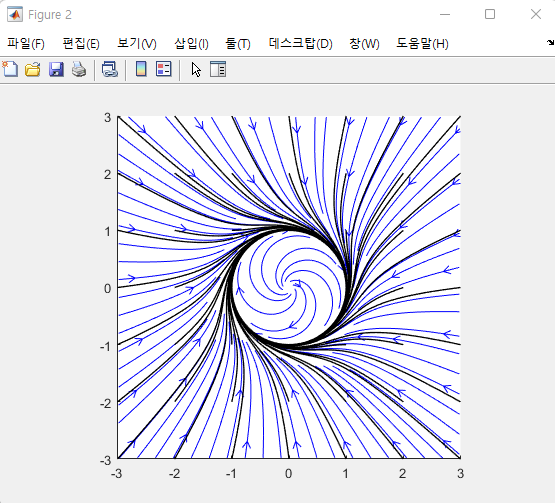 Phase portrait을 그려보면 c1, c2 는 다음과 같이 1로 수렴하게된다.