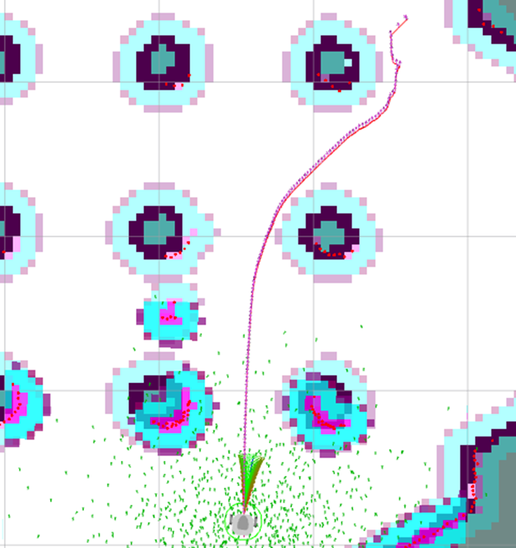 값이 작을수록 속도를 기반으로 짧은 시간동안 궤적을 생성하게 됩니다. 생성된 궤적은 장애물에 도달하는지 판별하게 되며 좁은 영역에서 충돌 가능성을 확인하다가 장애물을 마주하는 경우 갑작스럽게 대응하게 되지만 좁은 영역에서의 탐색은 장애물이 밀집된 공간에서 사이 사이로 회피하는데에 유리합니다.