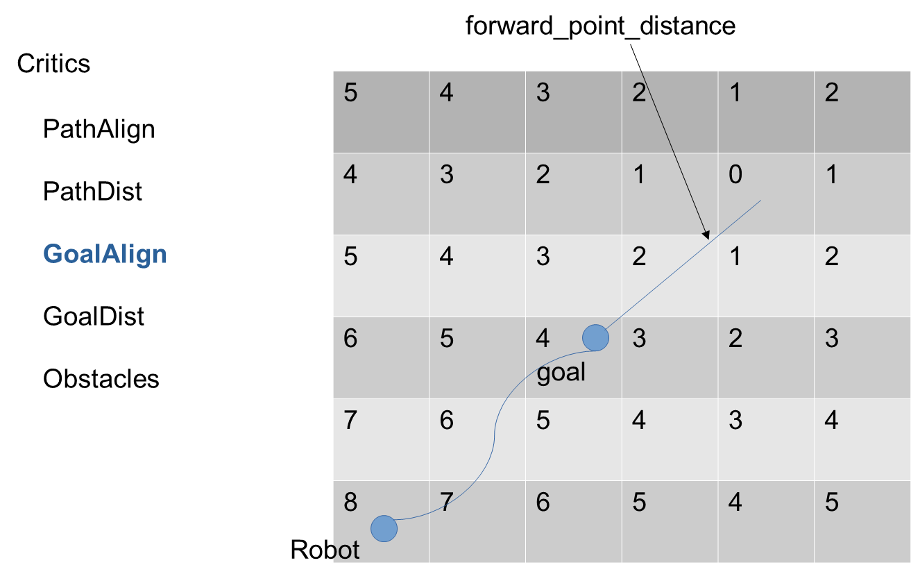 전역 목적 지점에 가깝지 않은 경우 (생성된 경로의 속도)*slowing_factor_ + scoreRotation(생성된경로에 대한 평가)로 평가되며 이는 모바일 로봇이 회전하는 동안 주행 속도가 늦춰지도록 장려합니다.