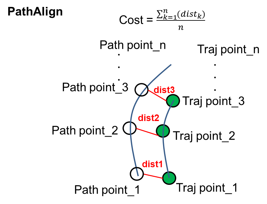 지역 경로점이 전역 경로점을 따르지 않을 때 비용이 높아지며, 지역 경로점들이 전역 경로 점들을 따르는 지역 경로를 선정하도록 유도하여 로봇이 전역 경로를 따르도록 합니다. 이에 대한 비용이 높아진다면 전역 경로의 목적지점에 가깝도록 하는 제어입력이 지배적이게 되며 이는 로봇이 목적지를 향해 더욱 빠르게 움직이는 것을 유도할 수 있습니다.